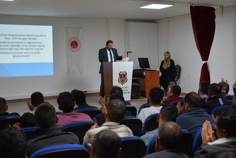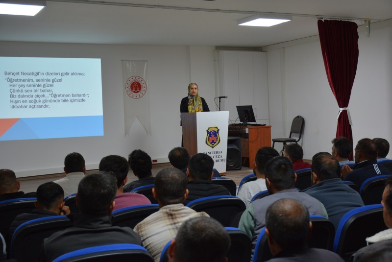 24 Kasım Öğretmenler Günü dolayısıyla Kurumumuzda hükümlülere yönelik anlamlı bir seminer gerçekleştirildi. Etkinlikte Eğitimci-Yazar Hasan Yıldız ile Rehber Öğretmen Müzeyyen Şengül, öğretmenlik mesleğinin toplumsal ve bireysel gelişimdeki rolü hakkında katılımcılara bilgilendirici bir sunum yaptı.
