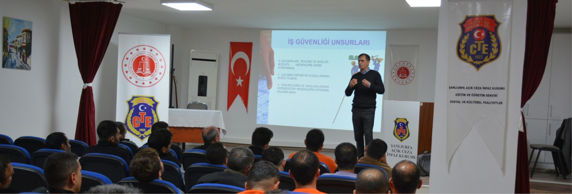Şanlıurfa Açık Ceza İnfaz Kurumu Müdürlüğü bünyesinde işyurdu müdürlüğümüze bağlı atölyelerde çalışan personeller ve hükümlülere yönelik İş sağlığı ve güvenliği eğitimi verildi. Alanında uzman İş sağlığı ve Güvenliği firması tarafından müdürlüğümüze bağlı atölyeler denetlenerek gerekli düzenlemeler ve verilecek eğitim ile alakalı teknik analiz yapılarak rapor düzenlenmiş olup; Akabinde çalışanlara eğitim verilmiştir.