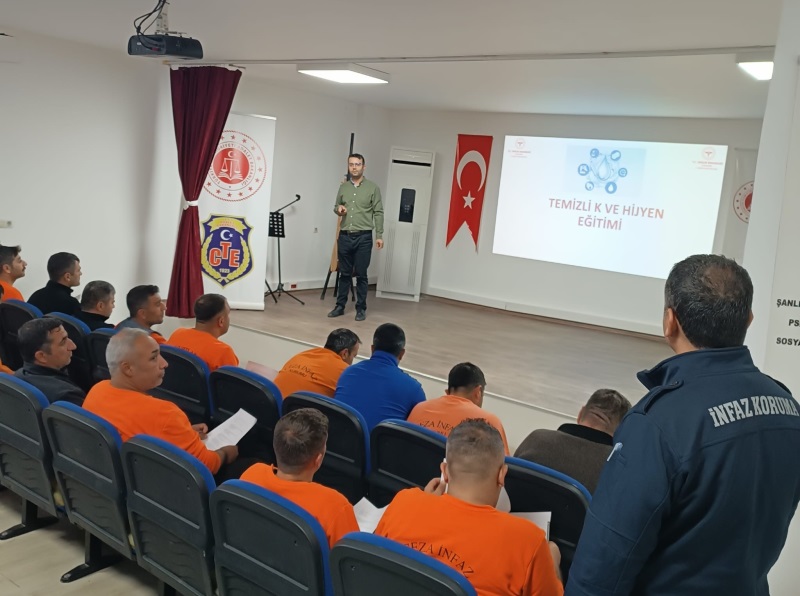 Kurumumuzda bulunan mutfak restoran, somun üretimi, ekmek üretimi, tatlı üretimi gibi birimlerde çalışan hükümlülere yönelik hijyen eğitimi düzenlendi. Şanlıurfa Karaköprü Halk Eğitim Merkezi ve Şanlıurfa Sağlık İl Müdürlüğü işbirliğiyle düzenlenen eğitimde gıda güvenliğinin sağlanması, sağlıklı üretim süreçlerinin oluşturulması ve bulaşıcı hastalıkların önlenmesi gibi eğitimler Hemşire Yusuf Kizir tarafından verildi. Eğitmen Kizir, mutfak ortamında dikkat edilmesi gereken kişisel hijyen kuralları, gıda saklama koşulları, çapraz bulaşma riskleri ve temiz su kullanımının önemi gibi konularda detaylı bilgiler paylaştı.